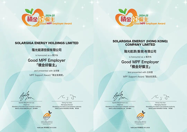 2025年11月25日,香港强制性公积金计划管理局(MPFA)公布了2025年度“积金好雇主”获奖名单,新利在线(以下简称“阳光能源”)及旗下阳光能源(香港)有限公司双双获得2025年度“积金好雇主”称号与“积金推广奖”荣誉。