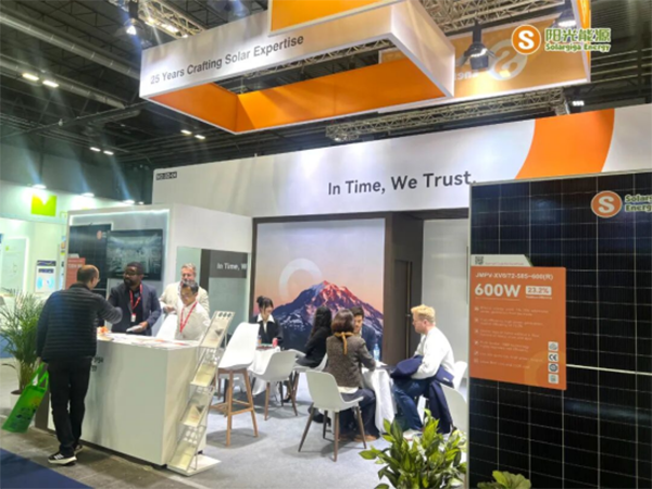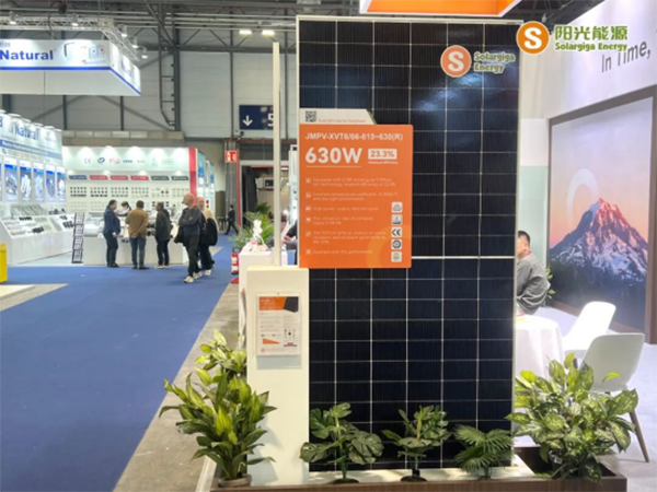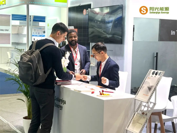 展会期间,阳光能源重点展示了三款高效组件产品,涵盖多种尺寸与应用场景。其中一款 Giga-N 系列 66 片的 210R 矩形组件,以 23.3% 的高效率成为现场焦点。该组件具备高功率输出、优异温度系数,在弱光环境中表现突出,同时 98.5% 的高集装箱空间利用率大幅降低运输成本;此外,其双面发电结构带来的 8% 至 30% 年发电增益,使其在地面电站及高效分布式项目中展现显著优势。