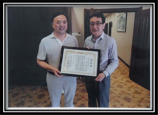 2013年9月 向井和司さん(右:シャープエナジー事業部本部長)がソーラーギガに感謝の意を示すため、谭文华さん(左:錦州ソーラーギガ会長)に感謝状を送りました。