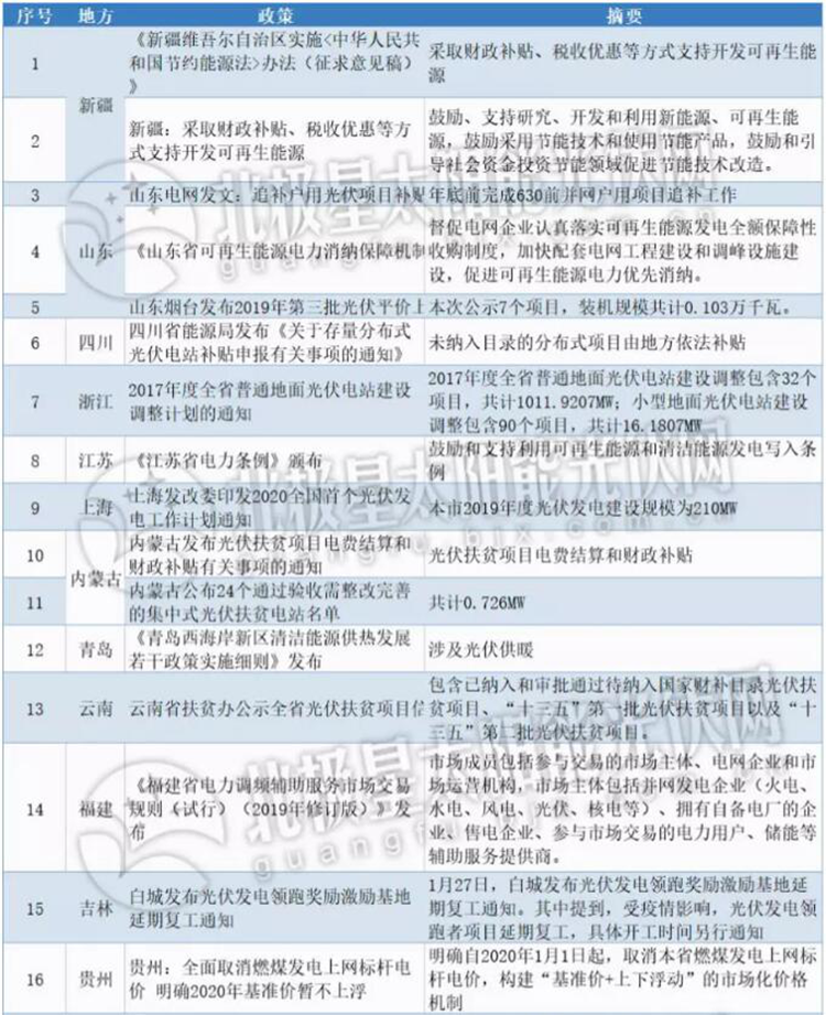 國家層面,從下表發現,國家政策的發佈時間聚集在月底,當大家沉浸在新春氛圍中時,能源局送來新春賀禮——2020年光伏建設方案出爐,雖然是徵求意見稿,但也明確了幾點內容,總補貼額為15億,其中競價專案(地面電站、分佈式)總額為10億,戶用光伏專案為5億;同時,光伏總體消納能力將於3月底揭曉,今年擬新建的補貼競價專案將在4月底開展,可見,國家對光伏的建設正有條不紊的進行。